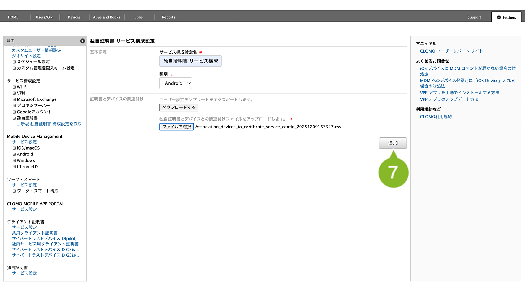 ファイルの作成例や詳細については、証明書とデバイスの関連付け CSV ファイルの書式と作成例をご参照ください。
