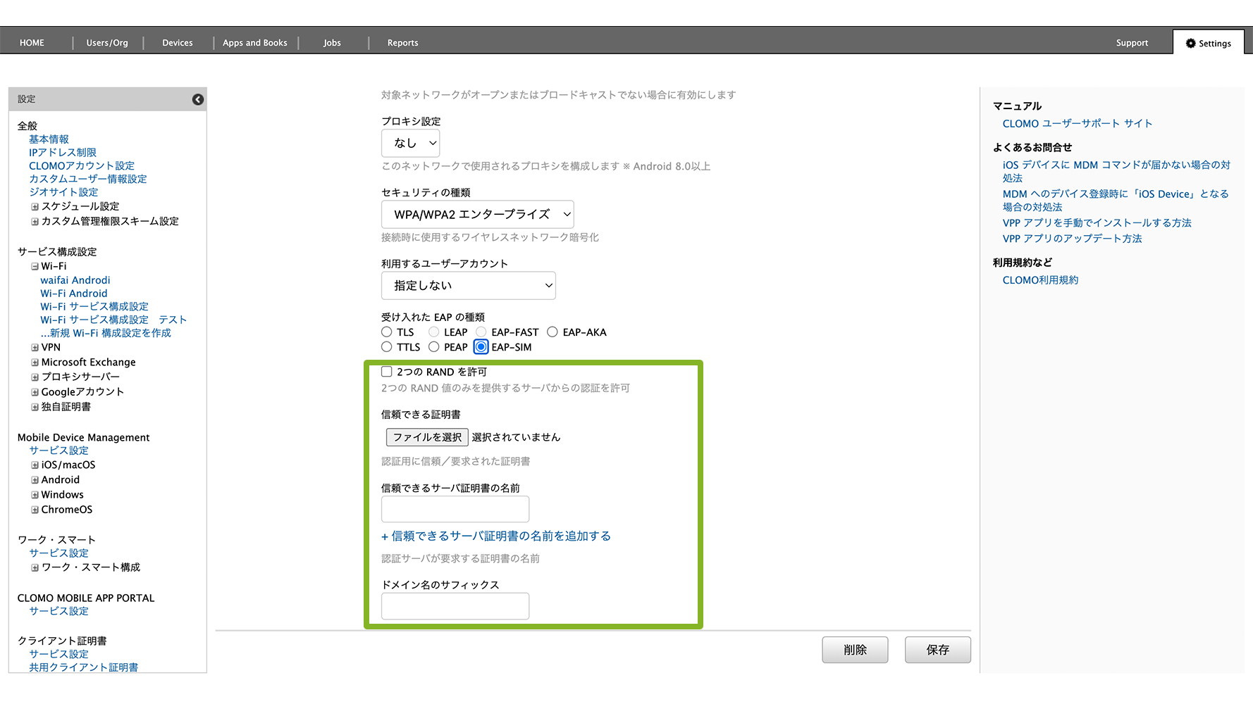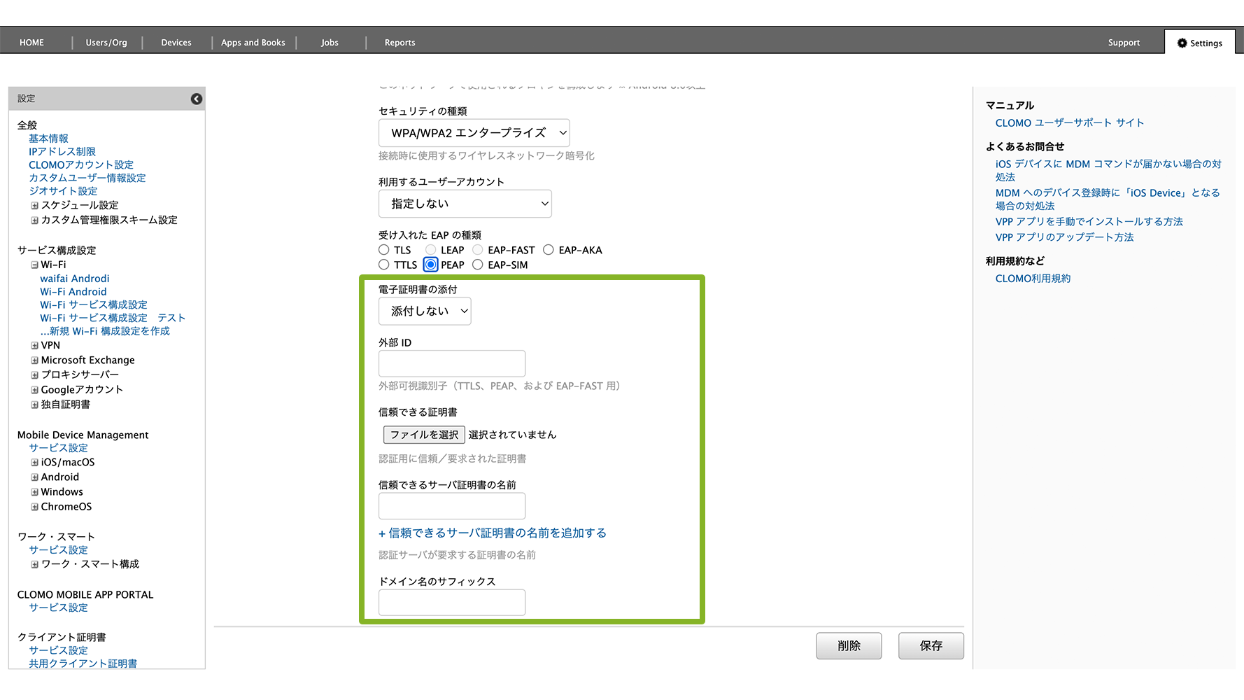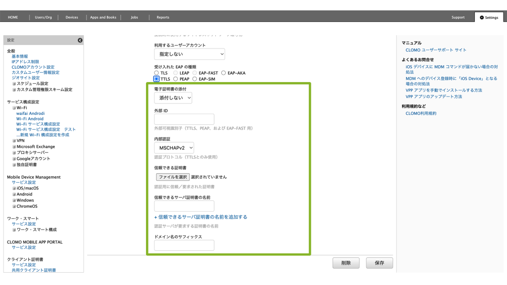 作成後、Wi-Fi サービス構成設定に作成した設定を組み込みます。設定方法は、サービス構成設定「独自証明書」で設定した情報を組み込む場合をご参照ください。