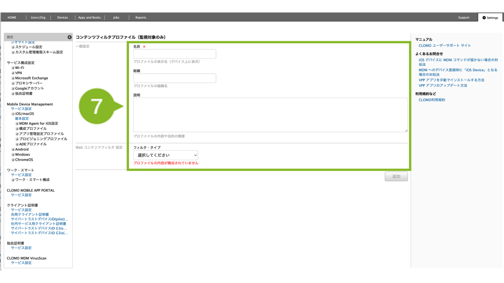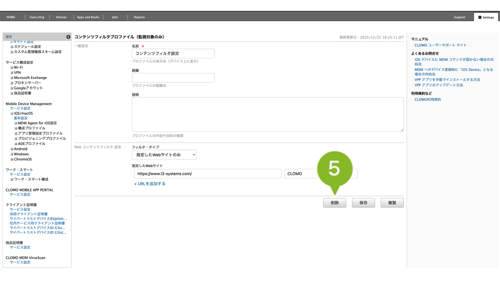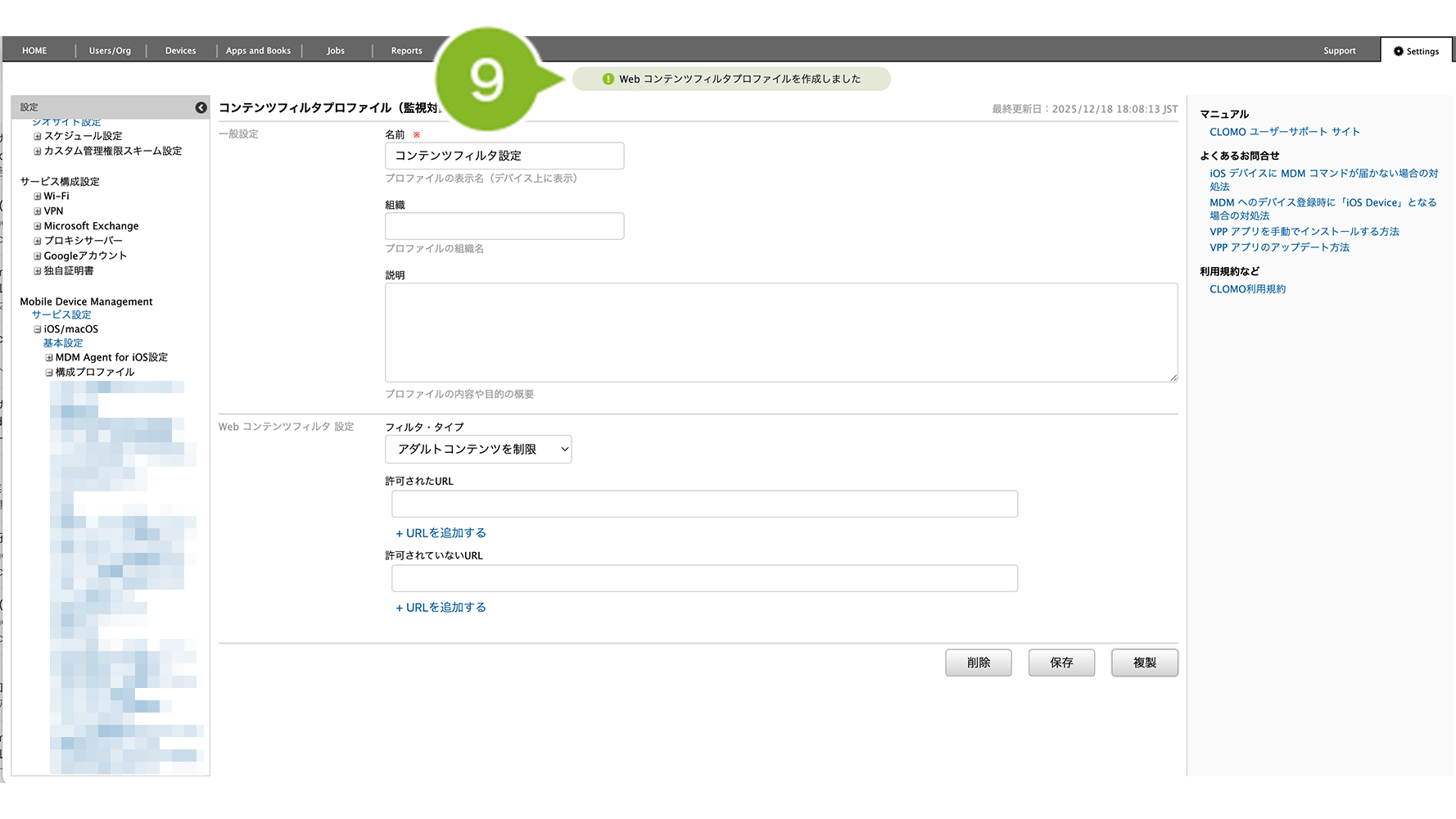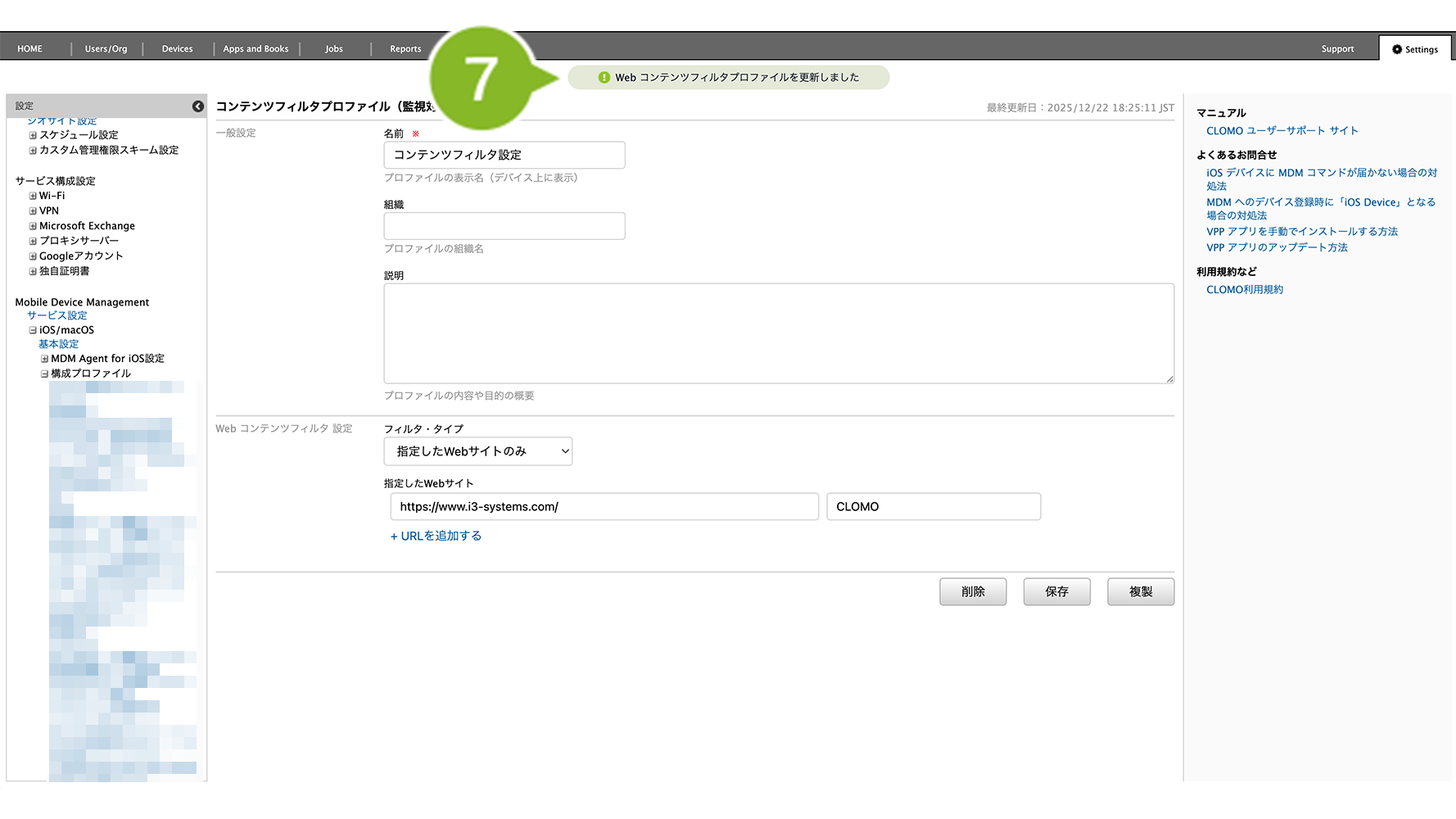 編集完了後、該当の「コンテンツフィルタプロファイル」を個別適用しているデバイスには、プロファイルの再適用が必要です。