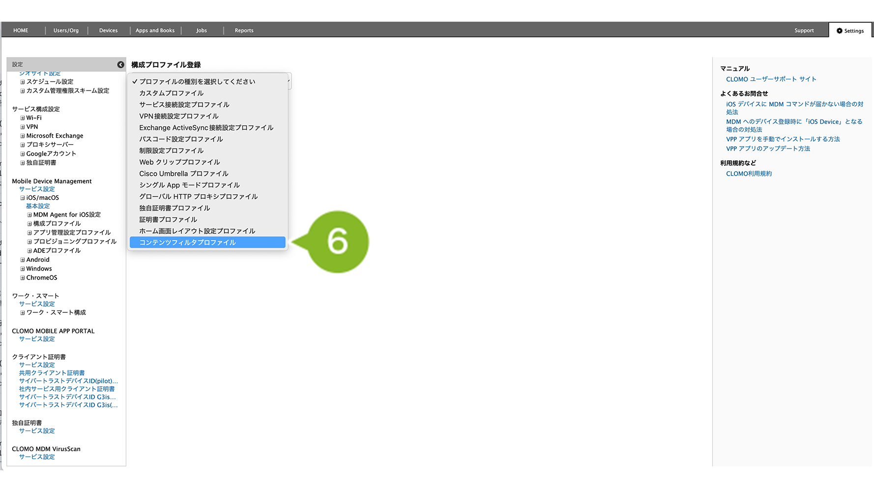 6.[コンテンツフィルタプロファイル]をクリックします。