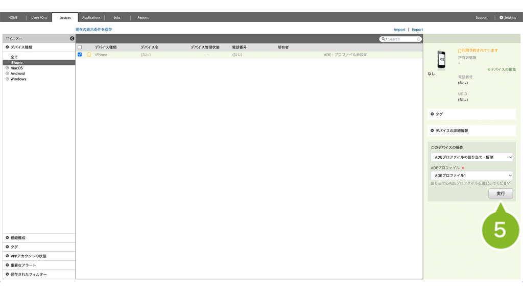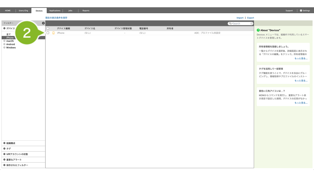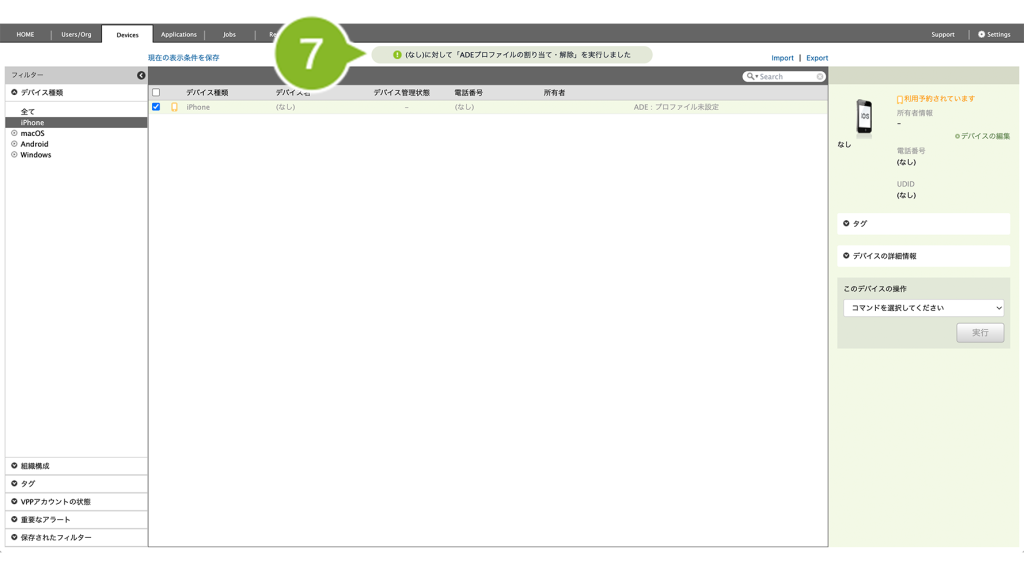 デバイスが登録されていない場合や、「所有解除済み」と表示されている場合は、【iOS】ADE デバイスとして登録されていないデバイスを ADE 化する場合のセットアップをご参照の上、2-2まで完了させてください。