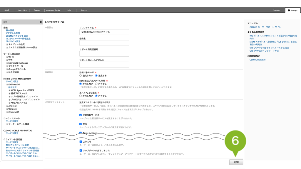 詳細は、CLOMO MDM に登録する iOS デバイスすべてに自動適用設定をしたい場合をご参照ください。