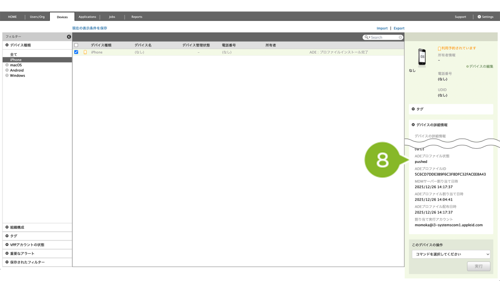 8.[デバイスの詳細情報]をクリックして、「ADE プロファイル状態」が「assigned」もしくは「pushed」となっていることを確認したら完了です。