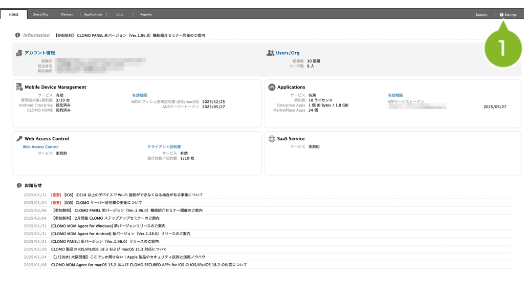 1. CLOMO PANEL にログイン後、[ Settings ] をクリックします。