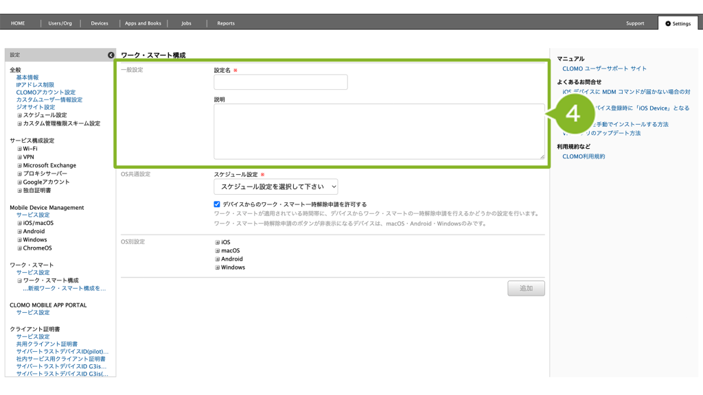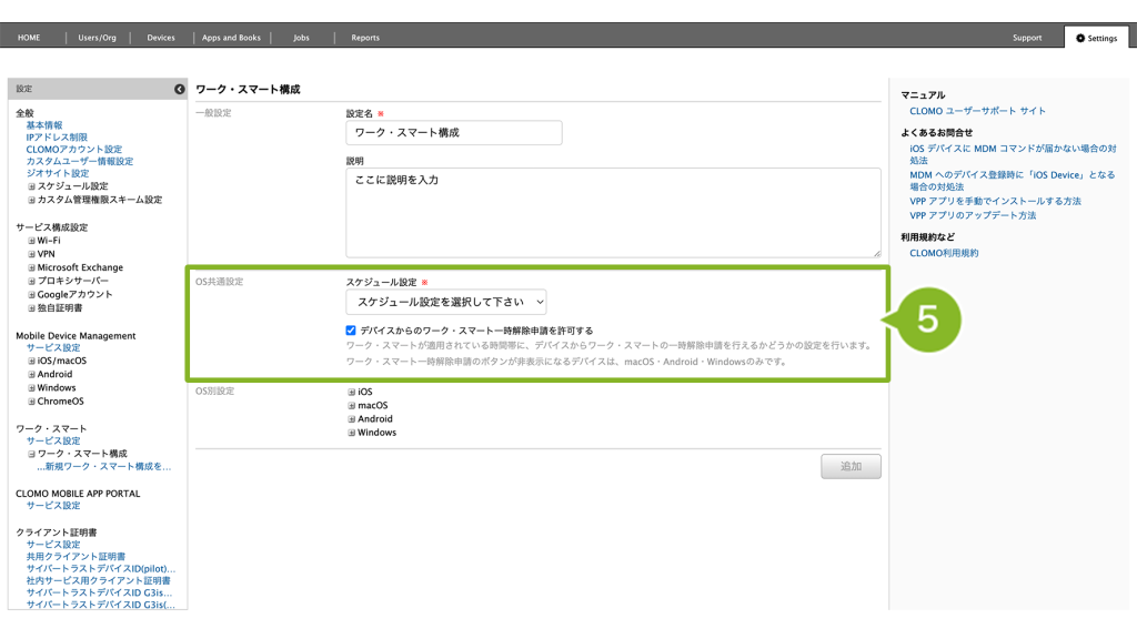 ワーク・スマートが適用されている時間帯に、デバイスからワーク・スマートの一時解除申請を行えるようにする場合は「デバイスからのワーク・スマート一時解除申請を許可する」にチェックが入っている状態にしてください。