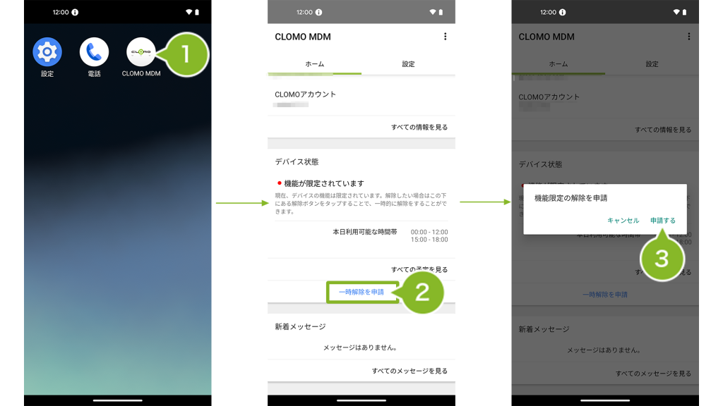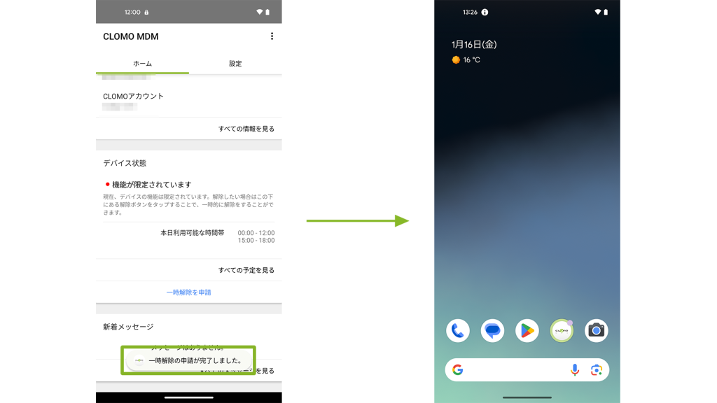 CLOMO MDM Agent for Android を選択後、[一時解除を申請]をタップし[申請する]をタップします。