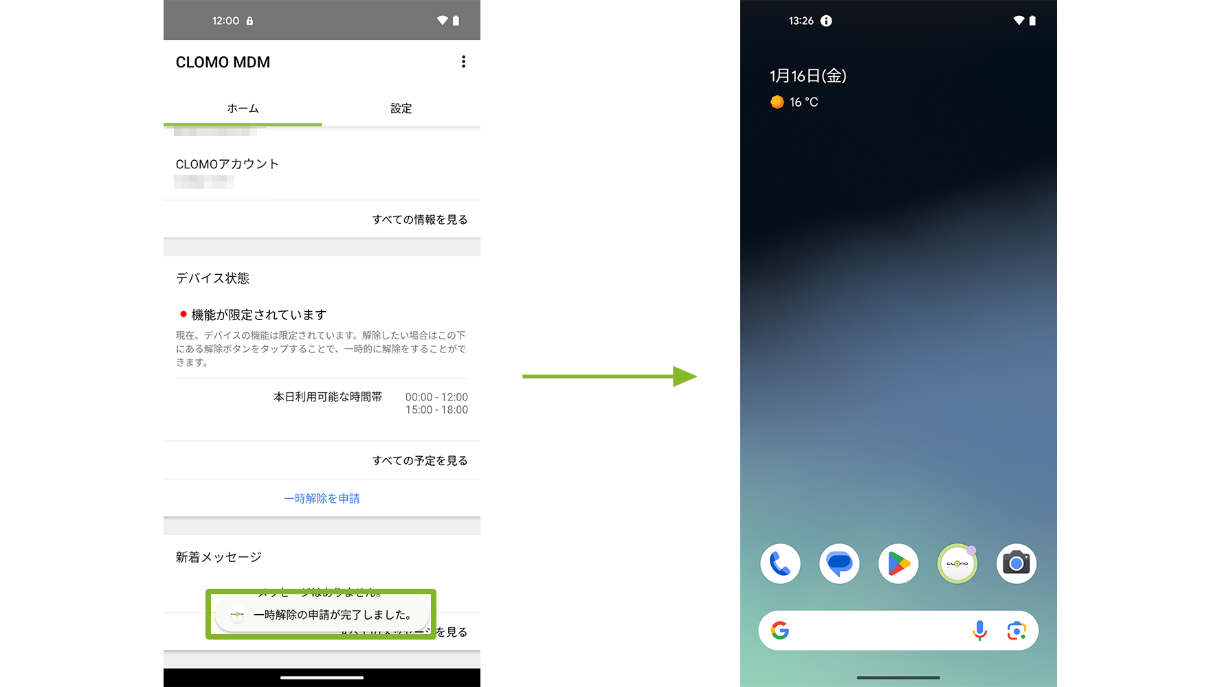 申請後は、一定時間経過後に通常通りデバイスを使用できます。