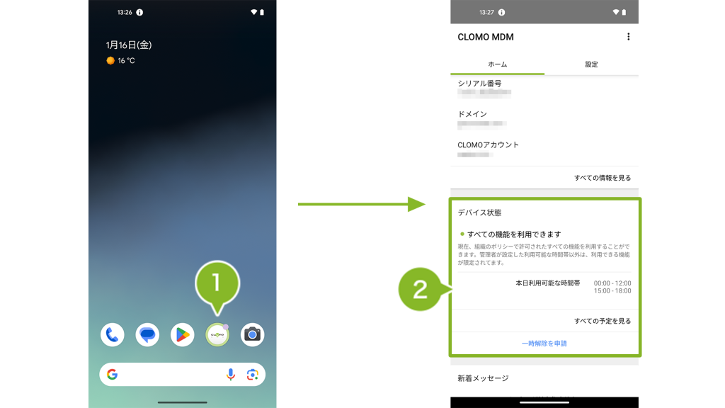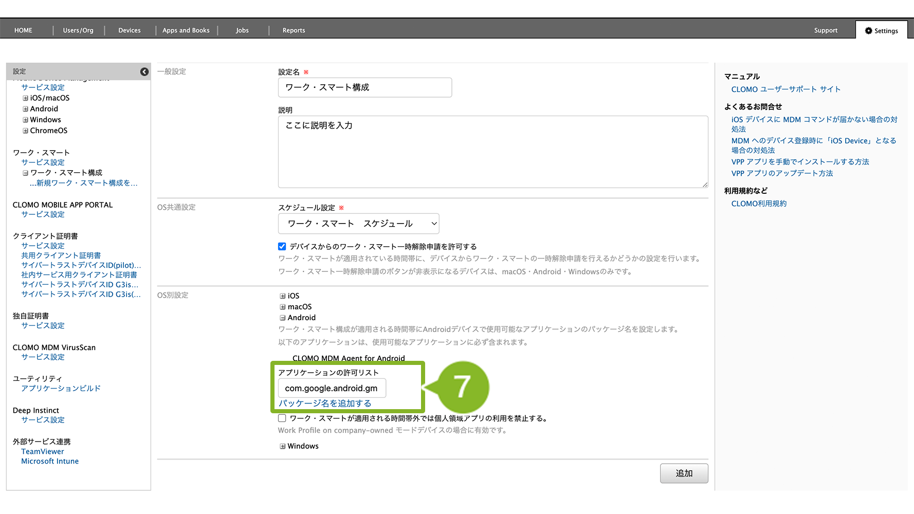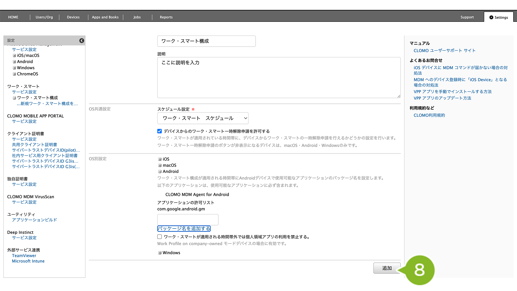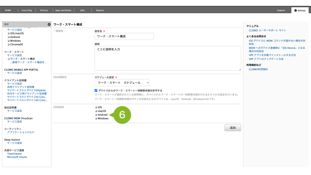 ワーク・スマートは、CLOMO MDM の管理者が設定を行い、全社または組織単位でデバイスに適用されます。