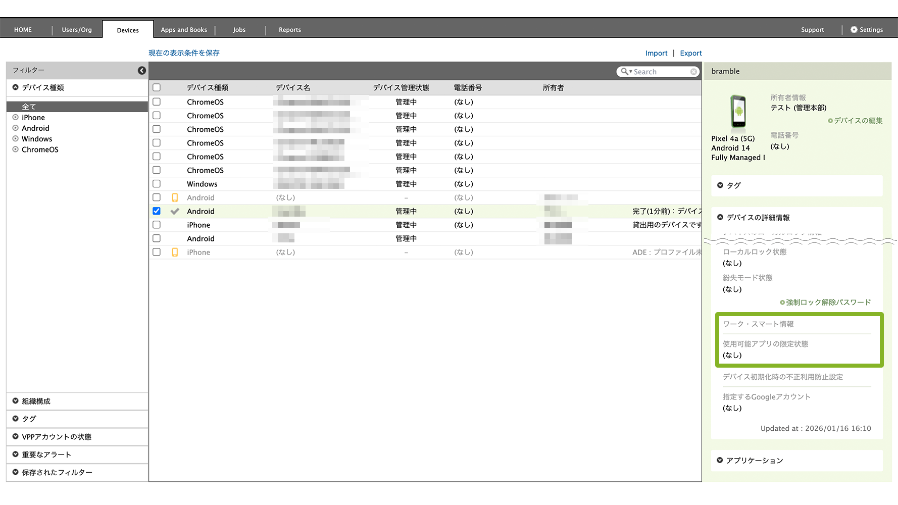 Devices 画面から該当のデバイスを選択し、「デバイスの詳細情報」から「ワーク・スマート情報」を確認できます。使用可能アプリの限定状態については以下の表をご参照ください。