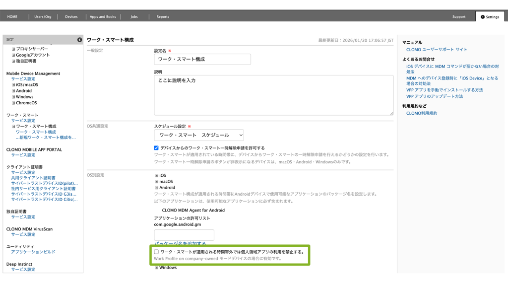 ワーク・スマートは、CLOMO MDM の管理者が設定をおこない、全社または組織単位でデバイスに適用されます。