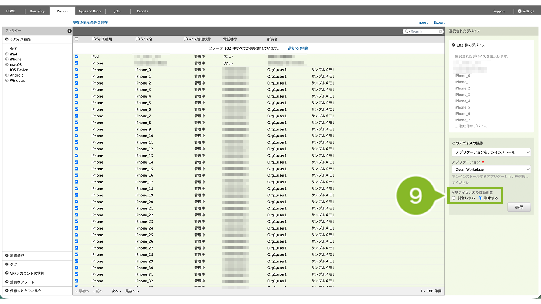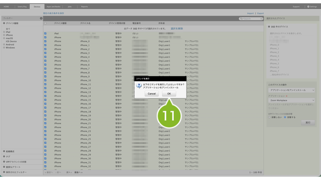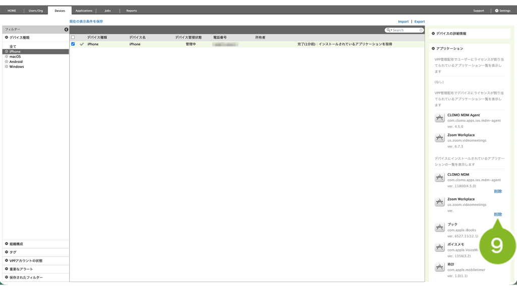 9. 他の方法として、「アプリケーション」内の [ 削除 ] をクリックするとアプリケーションがアンインストールされます。ただし、同時に VPP ライセンスの剥奪を行うことはできません。