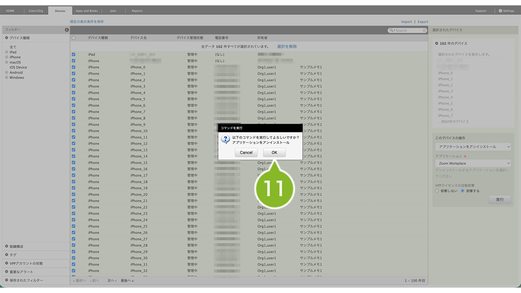 | 組織(一覧から選択):(アンインストールしたい組織名を選択) ※ 全デバイスを対象にしたい場合は、本項目は設定不要です。 | 特定の組織の iOS デバイスを検索したい場合は、本項目を追加してください。 |