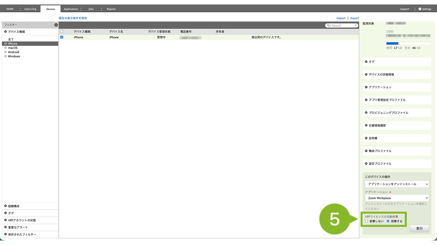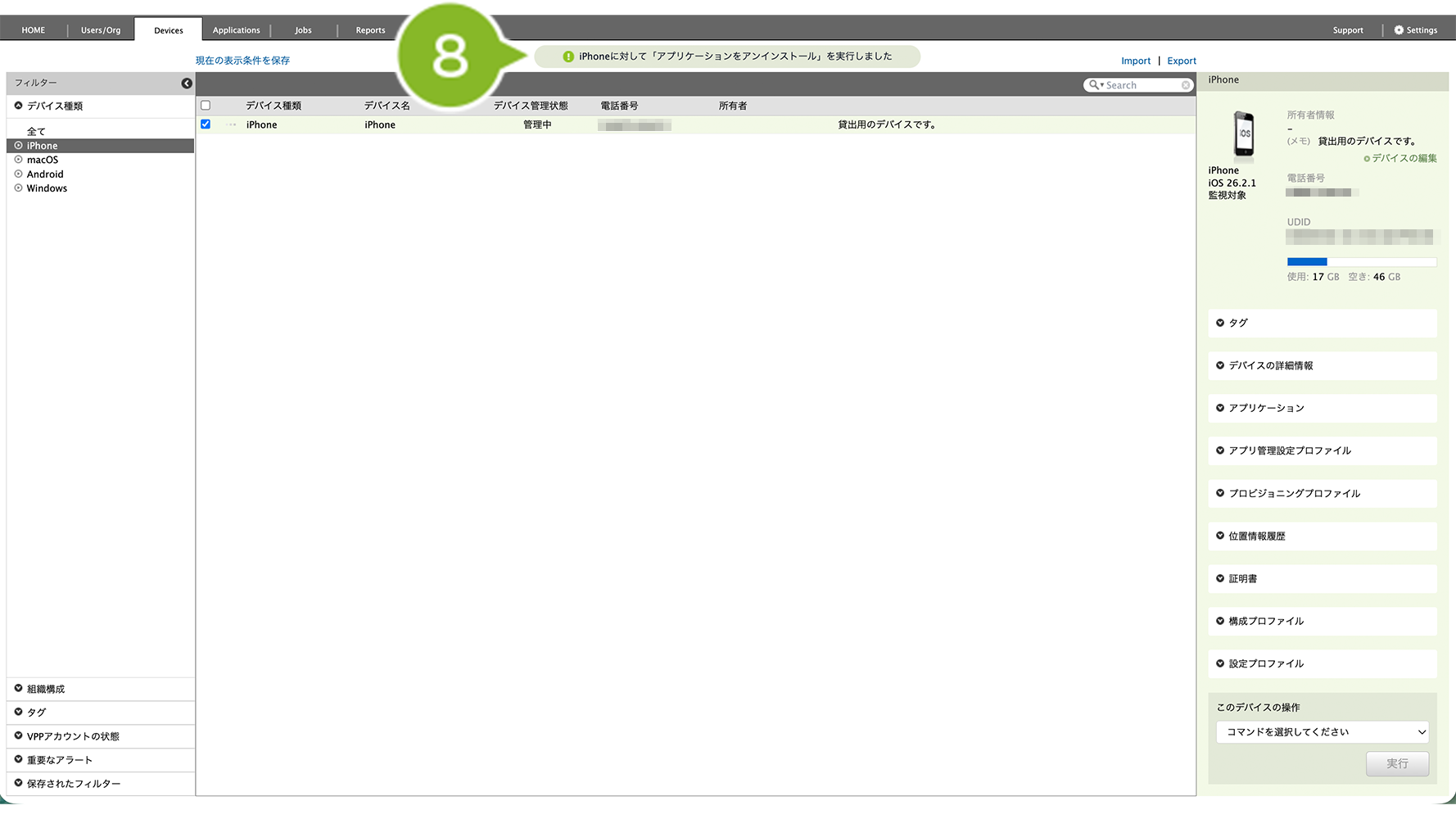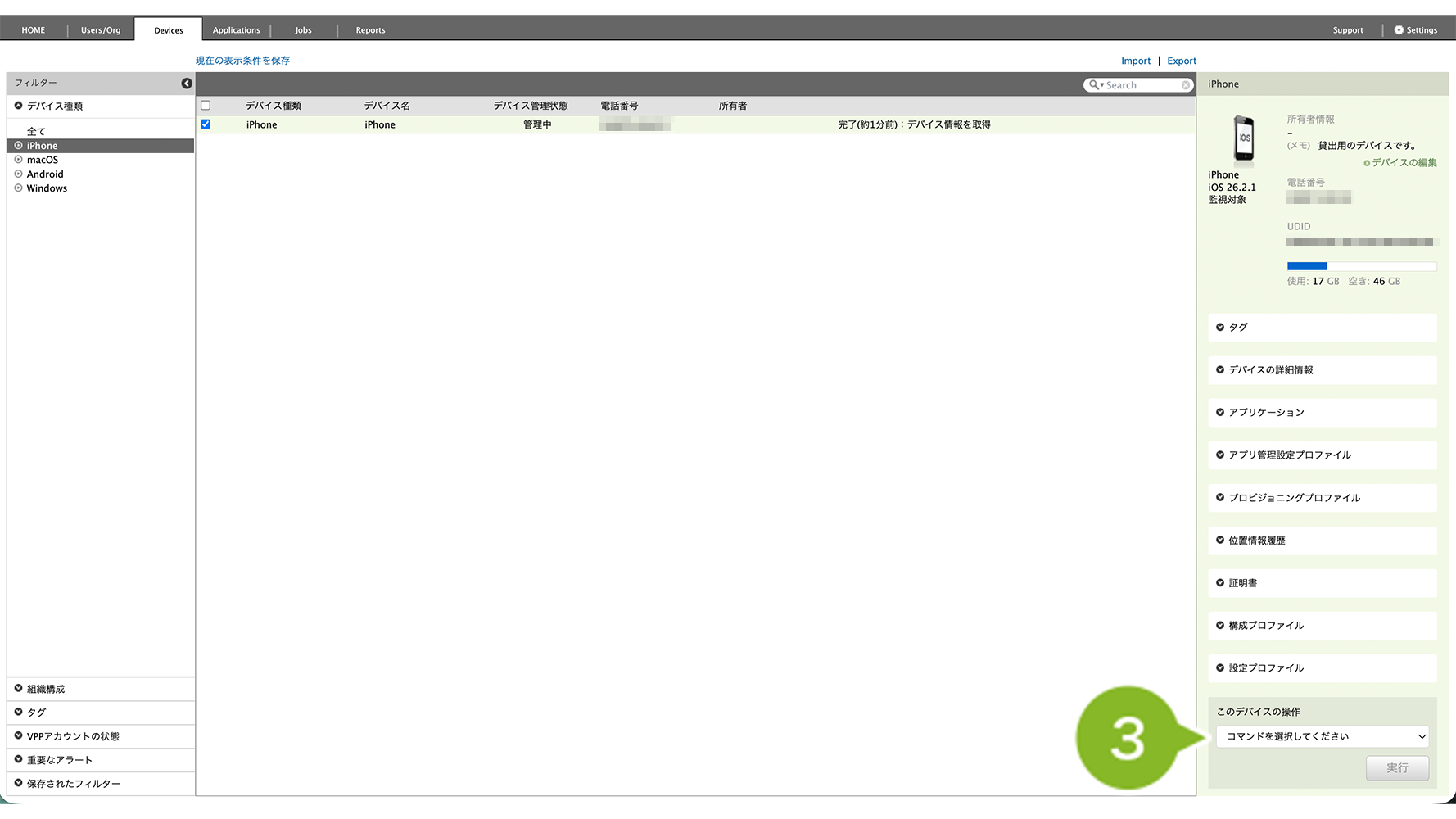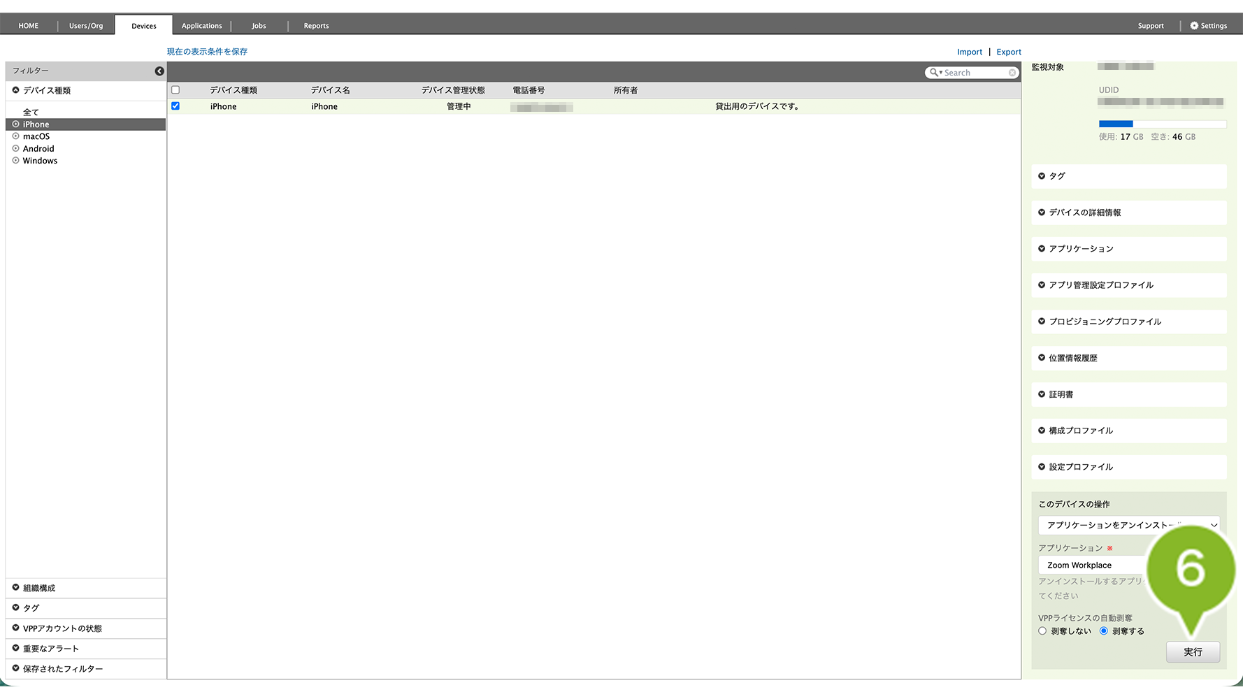 - 特定の1台を確認したい場合は、Devices 画面右側「アプリケーション」欄を確認(デバイス情報を取得・確認)