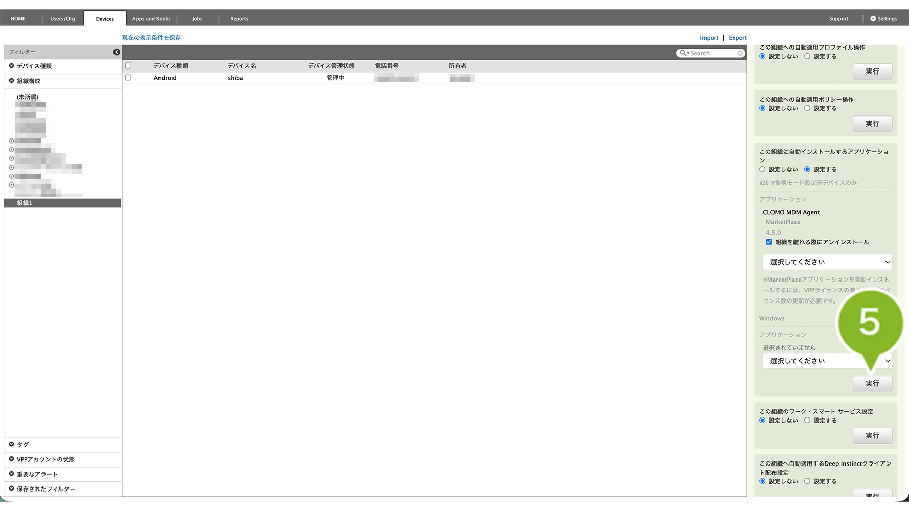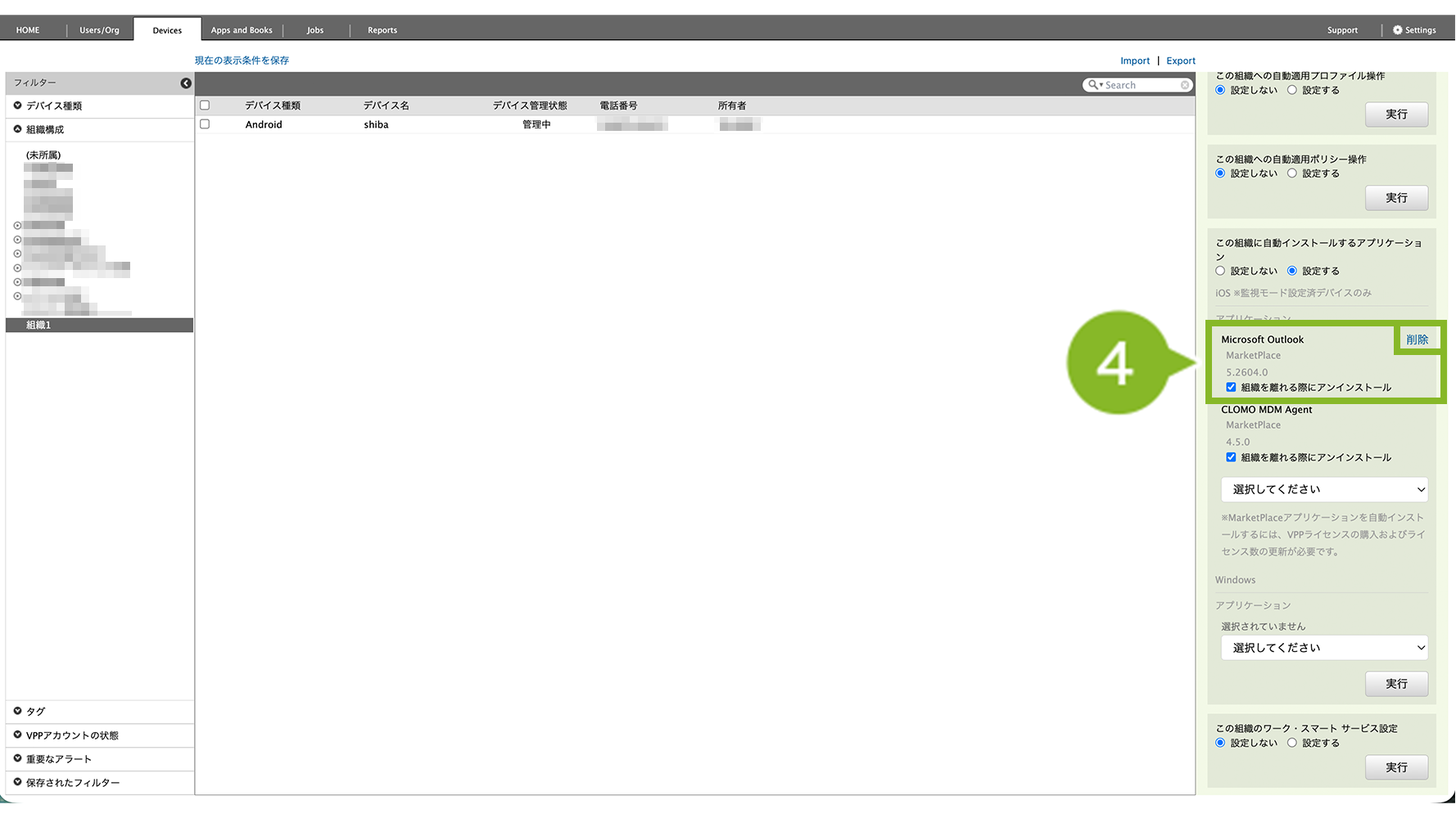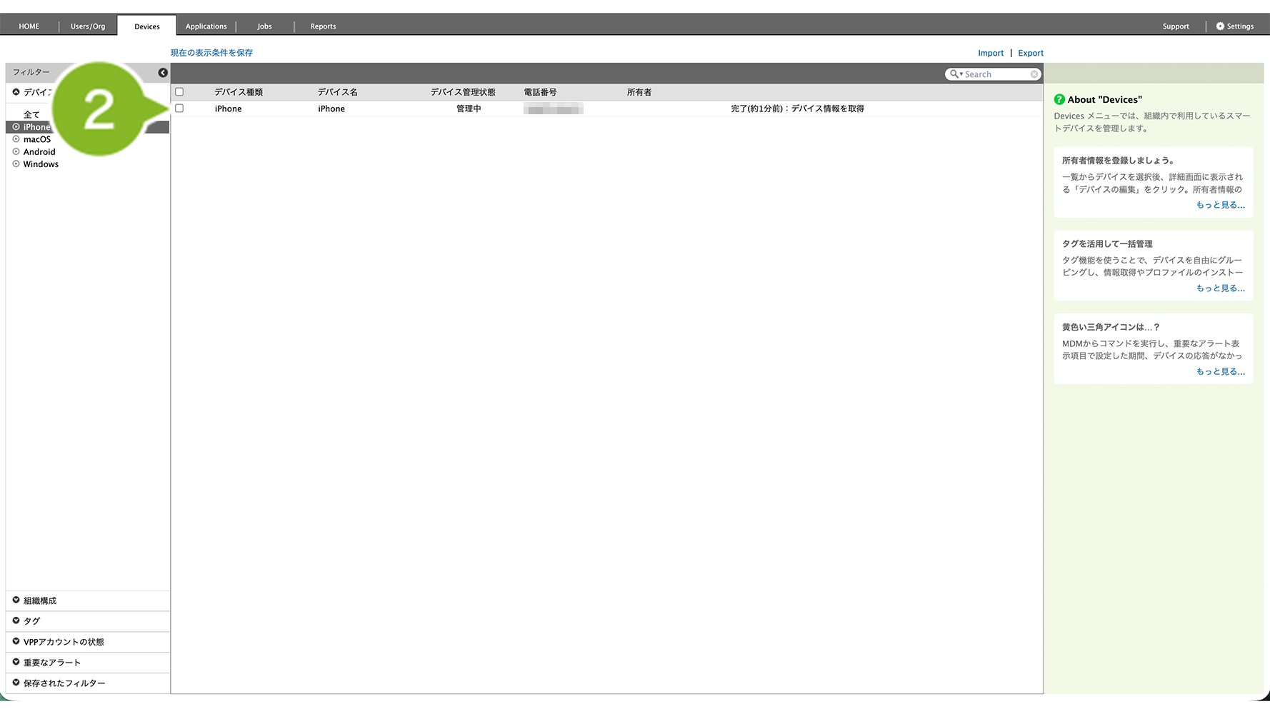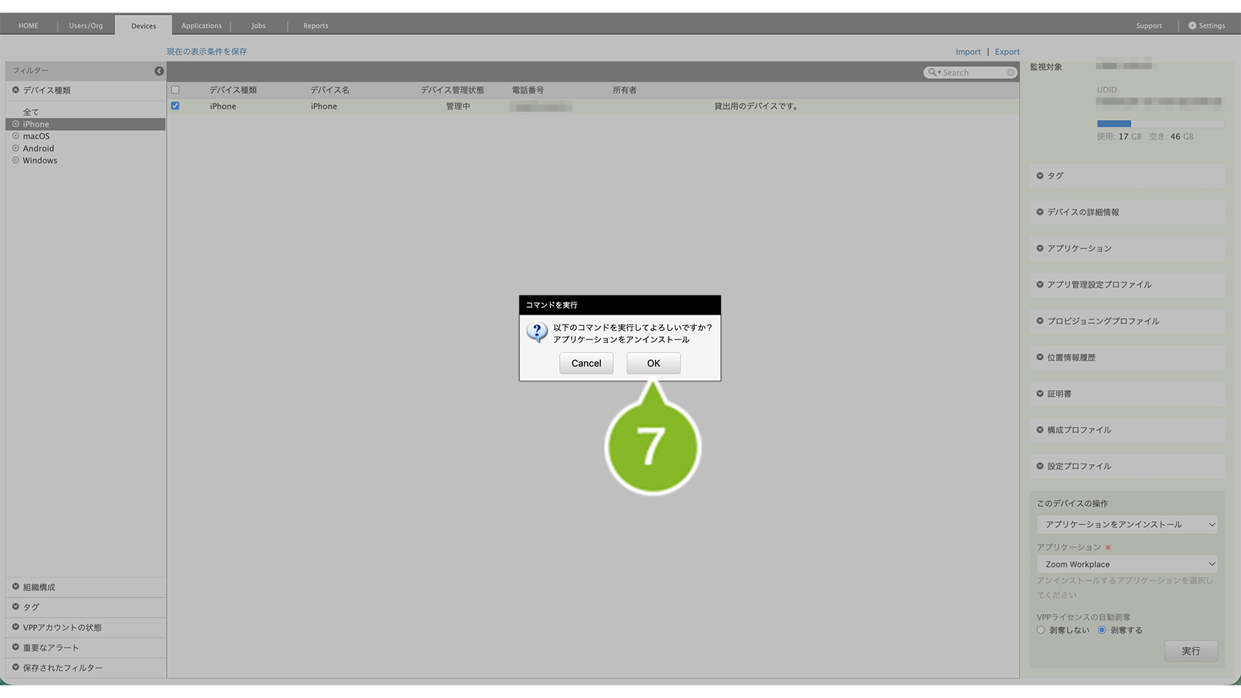 - 特定の1台を確認したい場合は、Devices 画面右側「アプリケーション」欄を確認(デバイス情報を取得・確認)