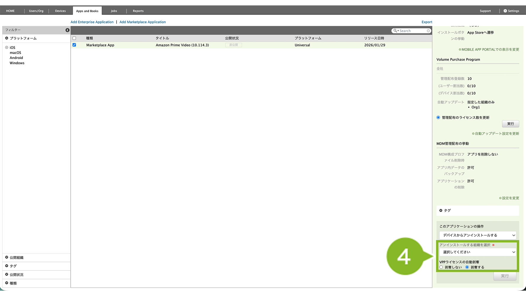 ※ MarketPlace アプリケーションのアンインストール時には、VPP ライセンスの剥奪も自動でおこなわれます。