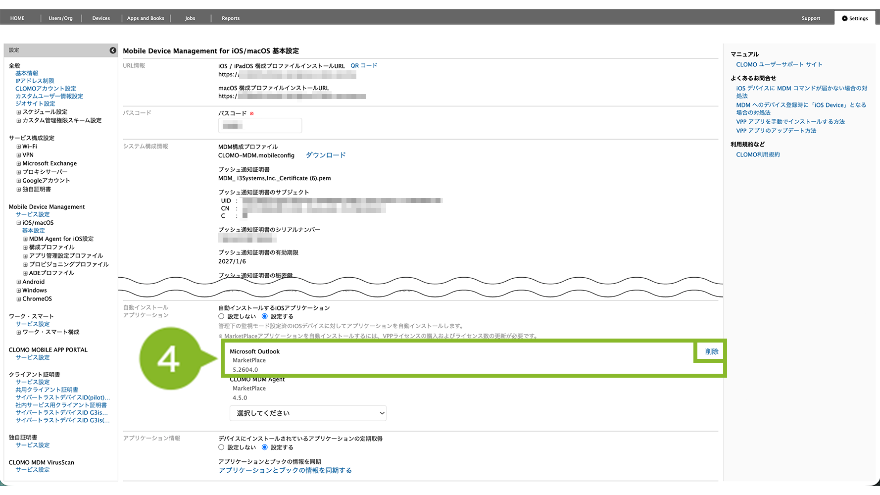 4.「この組織に自動インストールするアプリケーション」>「iOS」から、設定を解除したいアプリケーションにカーソルを合わせて[削除]をクリックします。