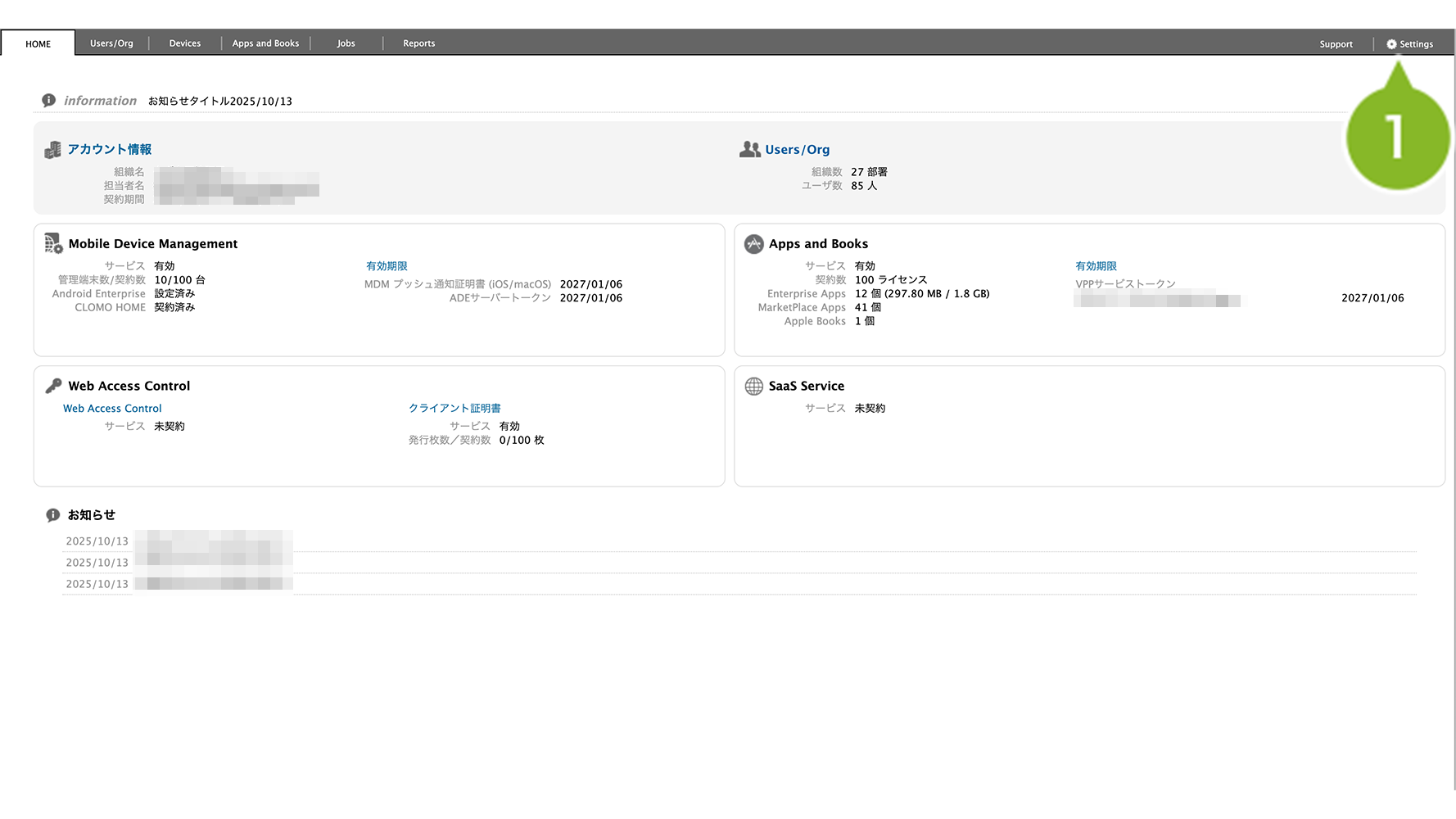 1. CLOMO PANEL にログイン後、[Settings]をクリックします。