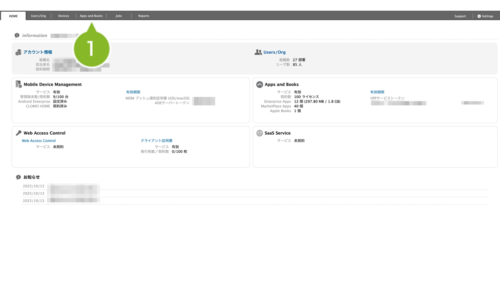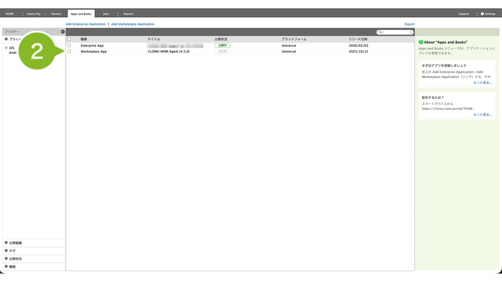1. CLOMO PANEL にログイン後、[Apps and Books]をクリックします。