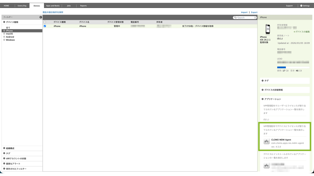 付与が完了すると、「アプリケーション」欄の「VPP 管理配布でデバイスにライセンスが割り当てられているアプリケーション一覧」に表示されます。