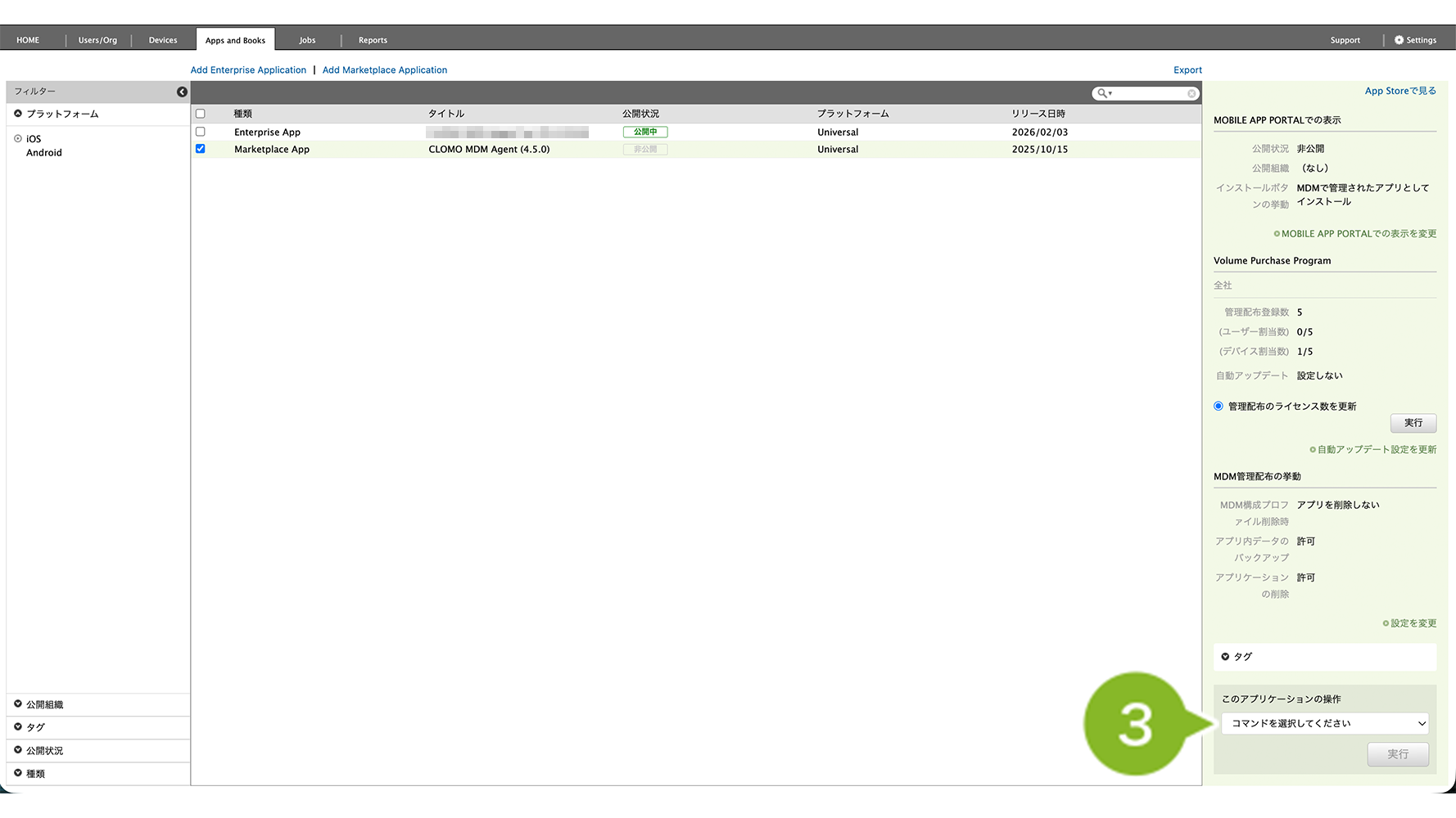 3.[コマンドを選択してください]から[VPP アプリケーションライセンスの付与(デバイス向け)]をクリックします。