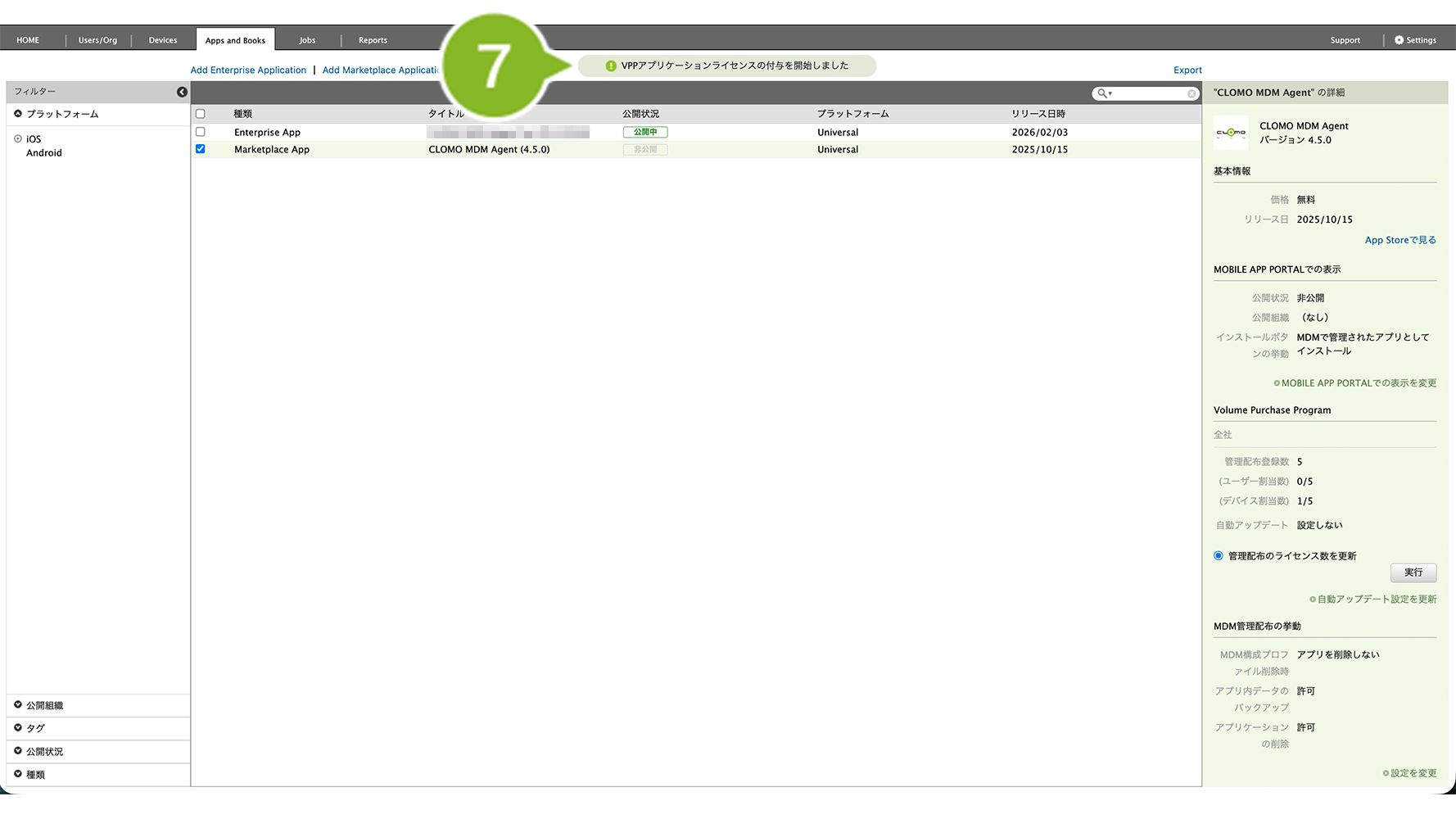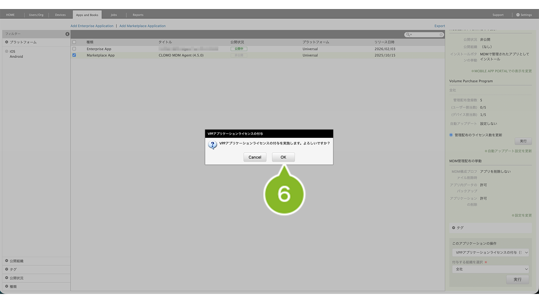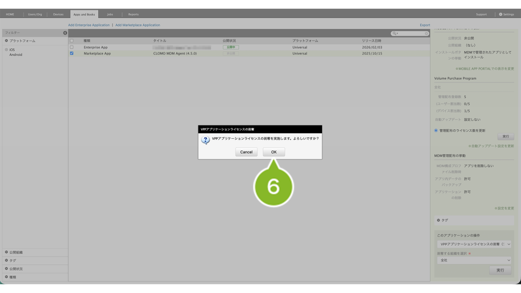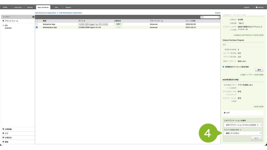 ※ 付与できない場合は、VPP ライセンス数が不足している可能性があります。Apps and Books 画面から VPP ライセンス数を同期して確認し、不足している場合は VPP ライセンスを購入してください。
